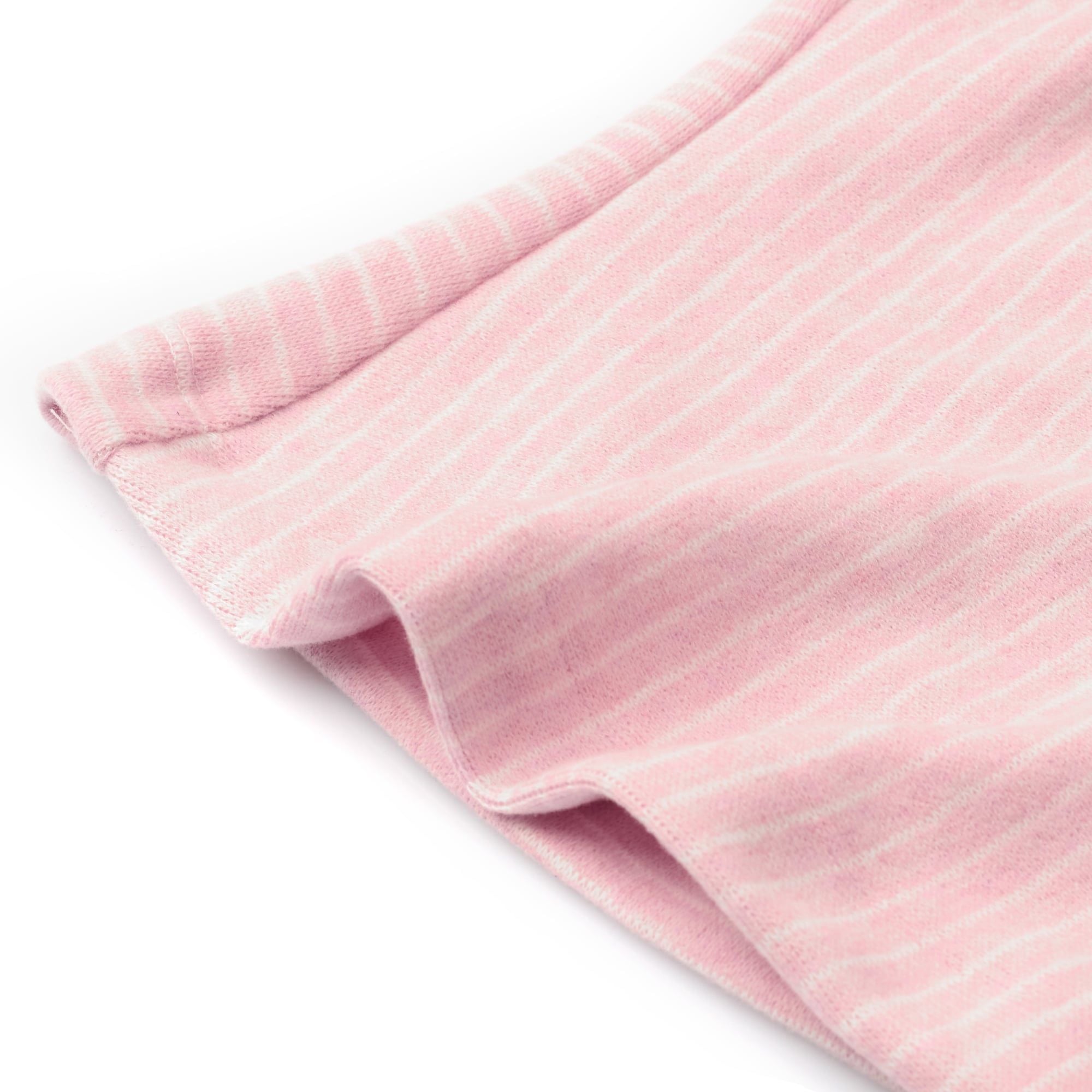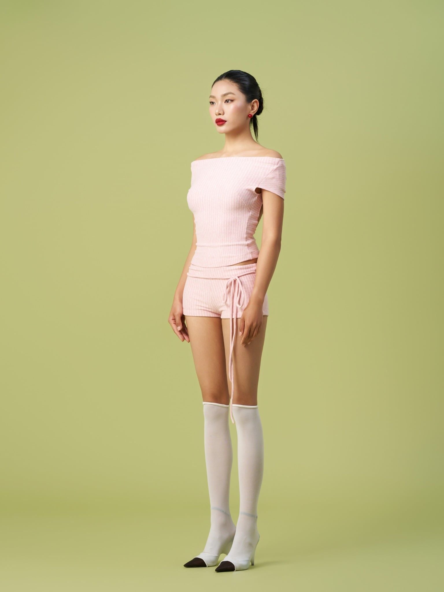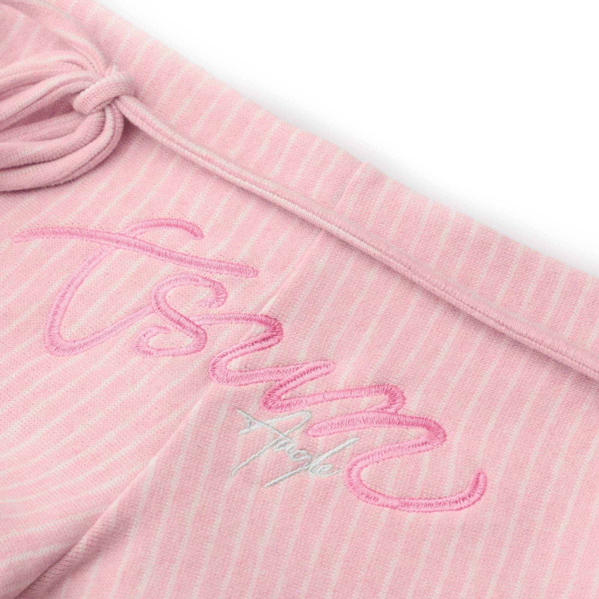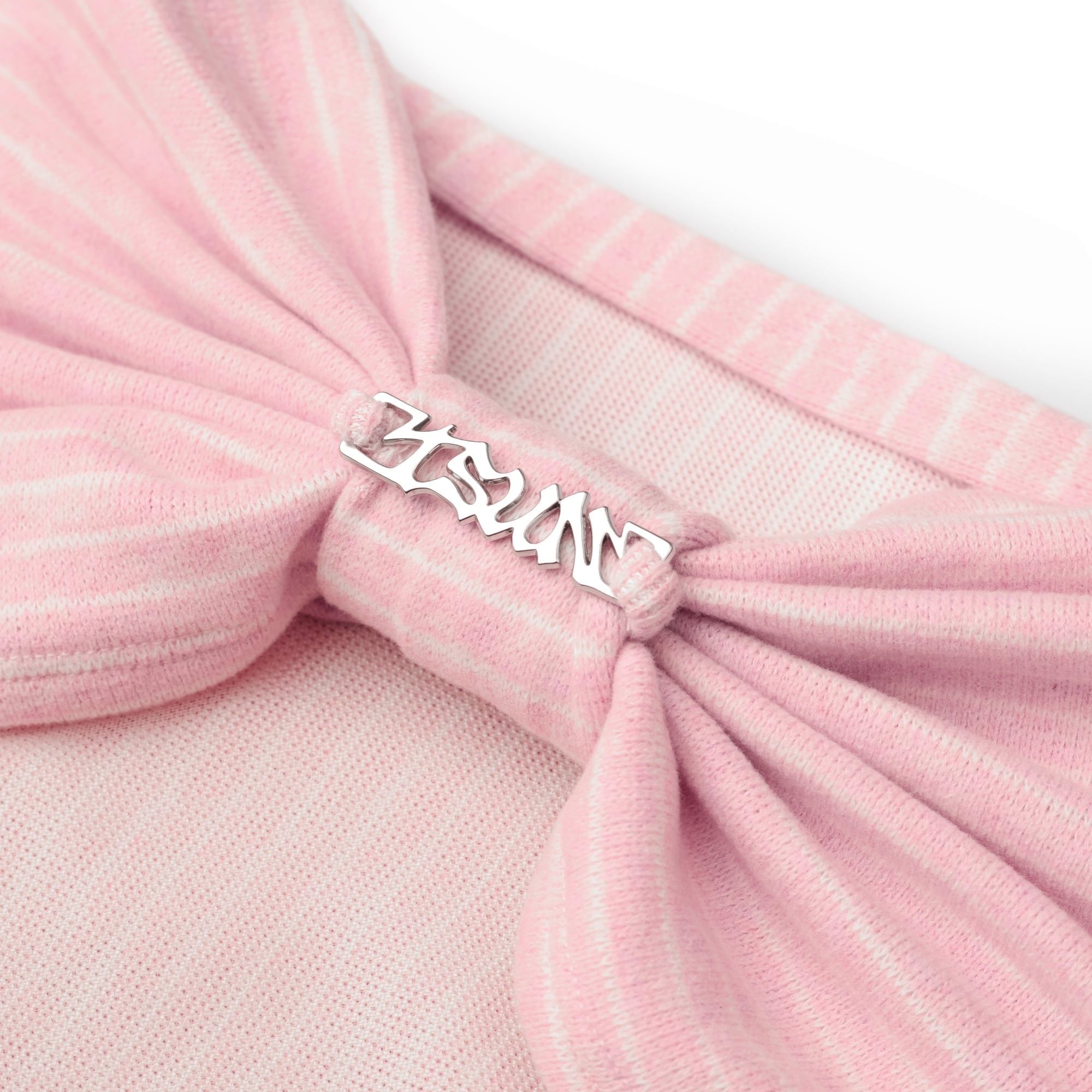 Vải thun sọc hồng trắng co giãn phối lưới tơ mỏng xuyên thấu phía sau lưng tạo điểm nhấn, đính logo kim loại không gỉ.