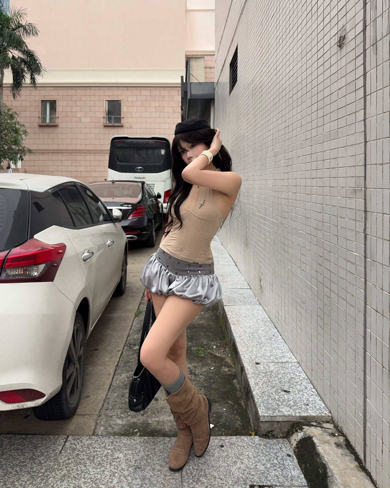 Quần giả váy dáng bí phồng tự nhiên. Lưng quần đính đinh tán không gỉ, logo được thêu tỉ mỉ.
