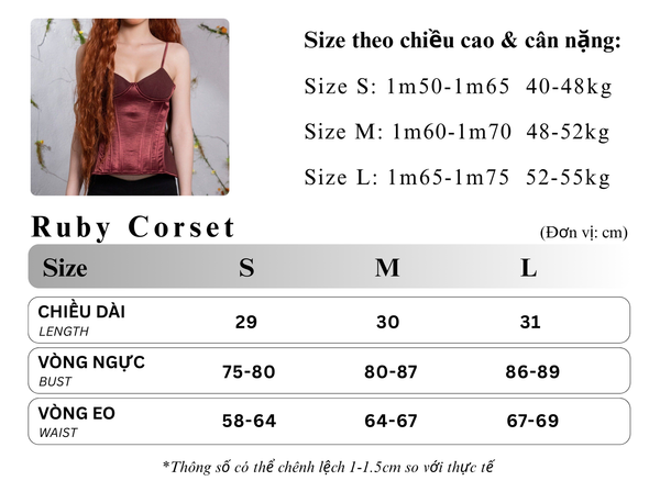 SKU:rubycorset1Vải lụa băng màu đỏ rượu bắt mắt được ép keo tạo độ dày cho corset, áo có sẵn mút ngực, gọng để định hình form dáng. Phần dây đan phía sau giúp tự do điều chỉnh độ rộng.